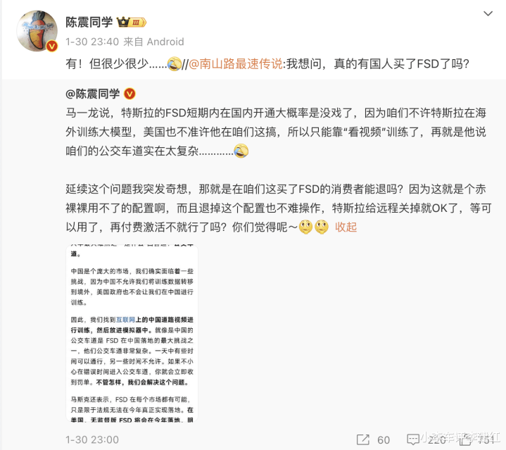 但是由于种种原因,满血版FSD一直没能进入国内市场,很多国内的小伙伴,花了6.4万元开通FSD功能之后,实际上只能用到很多国产造车新势力品牌提供的免费功能,也就是高速NOA功能和召唤功能。因此有博主呼吁,特斯拉应该退还车主购买FSD的费用,因为车主压根就没有享受到相应的功能!